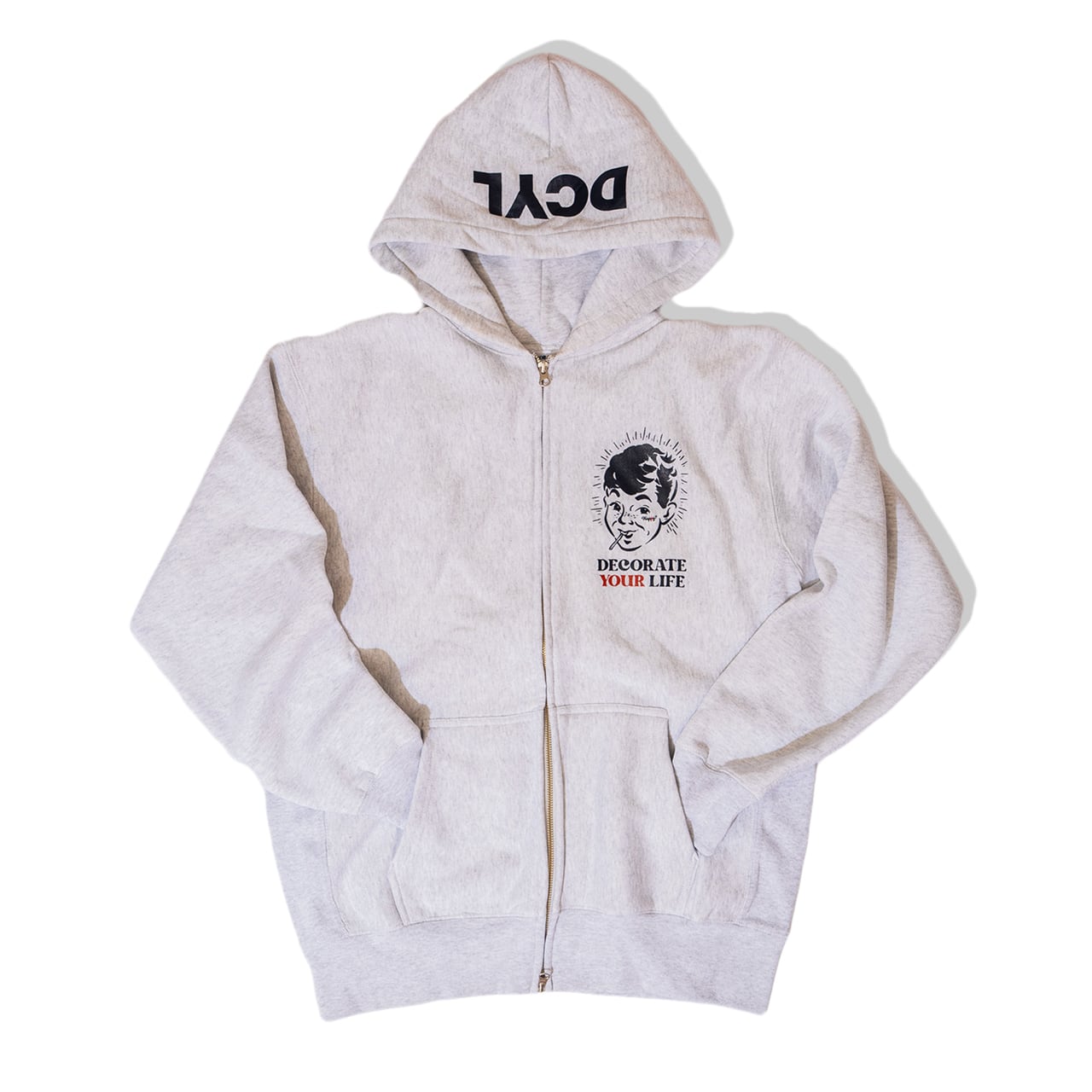 DECORATE YOUR LIFEのアイコニックキャラクター「DECO BOY」を胸元に、バックには存在感のあるロゴを大胆にプリントしたフルジップフーディ。