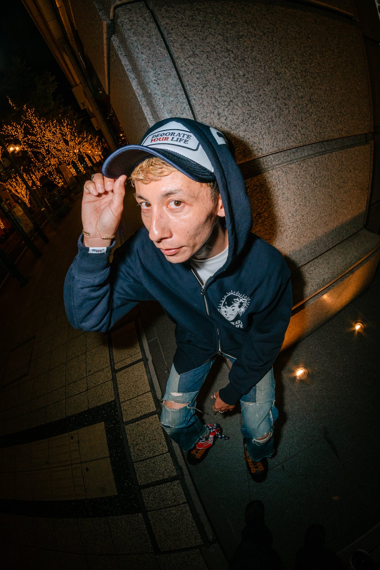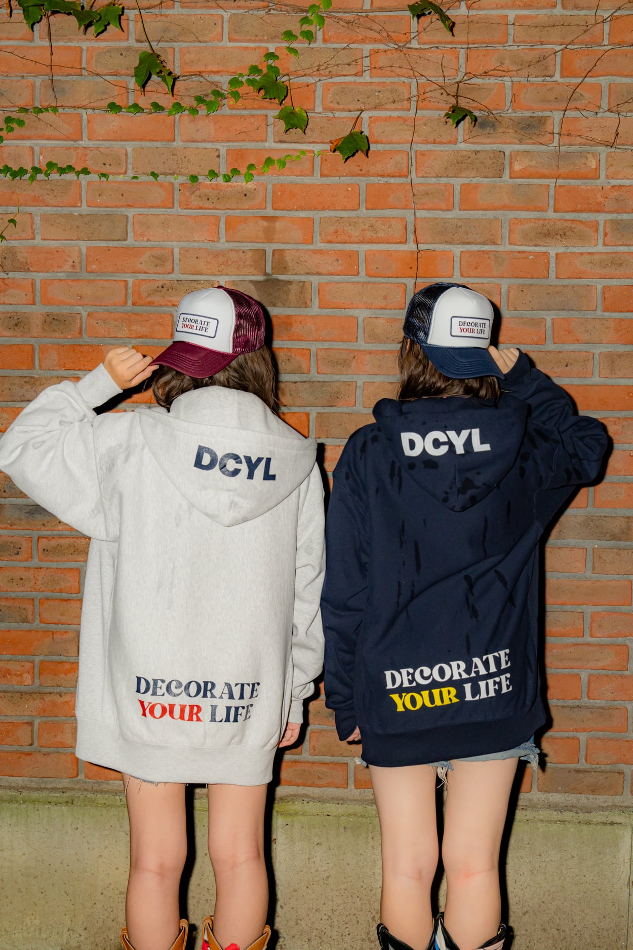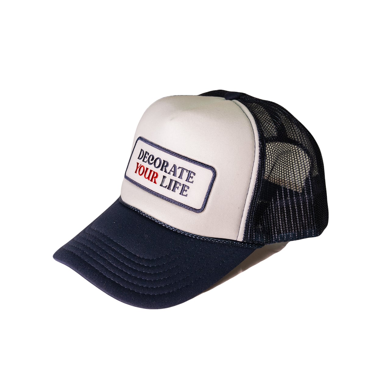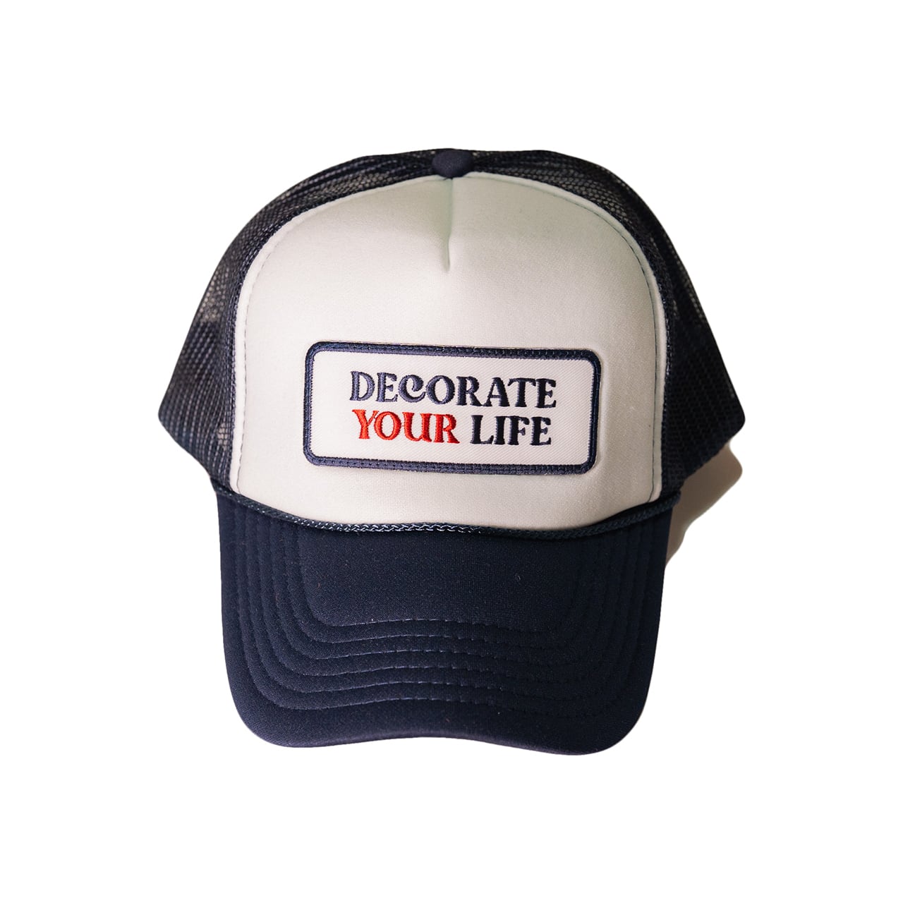 DECORATE YOUR LIFEのロゴワッペンをあしらったメッシュキャップ。