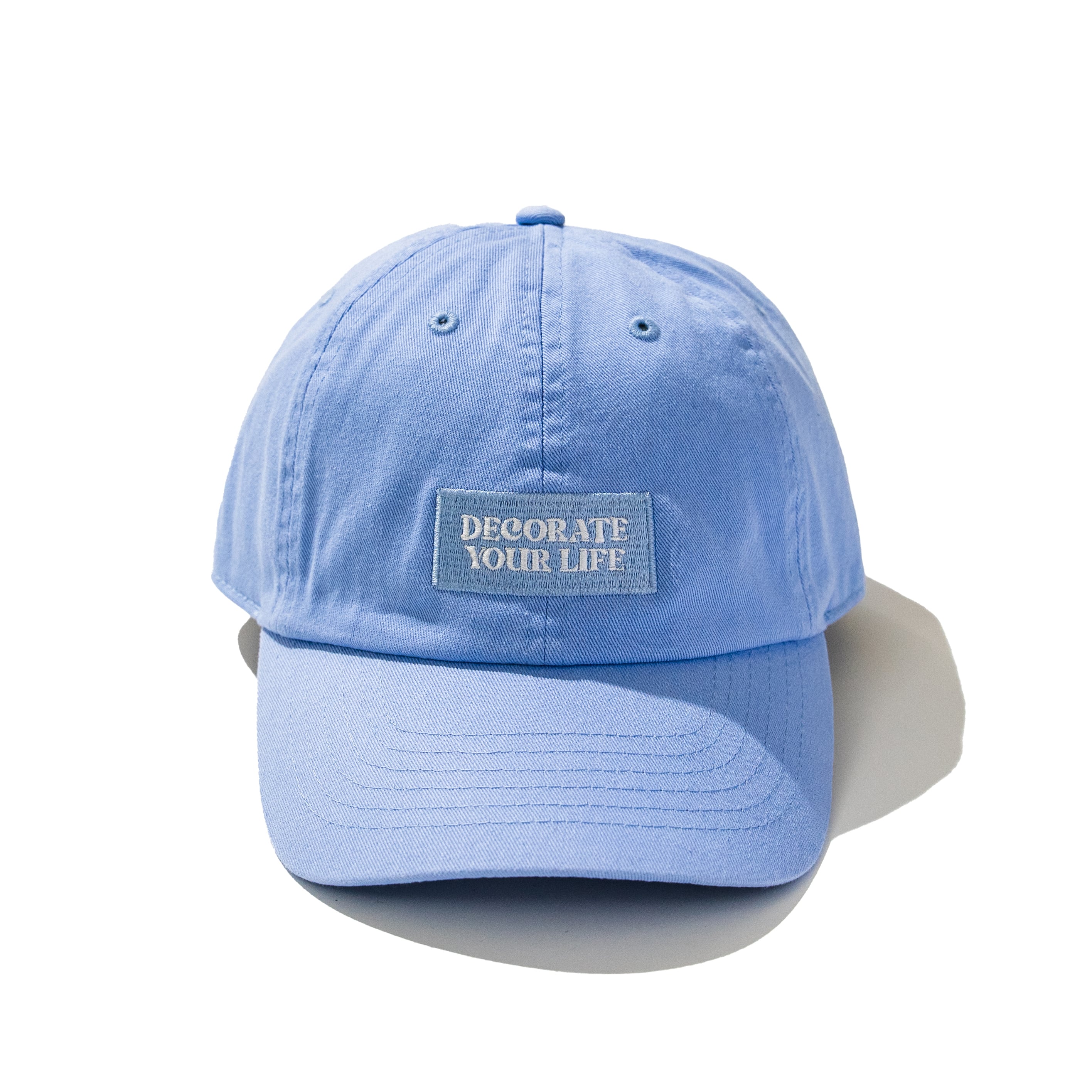 DECORATE YOUR LIFEのボックスロゴが刺繍されたパステルカラーのベースボールキャップ。