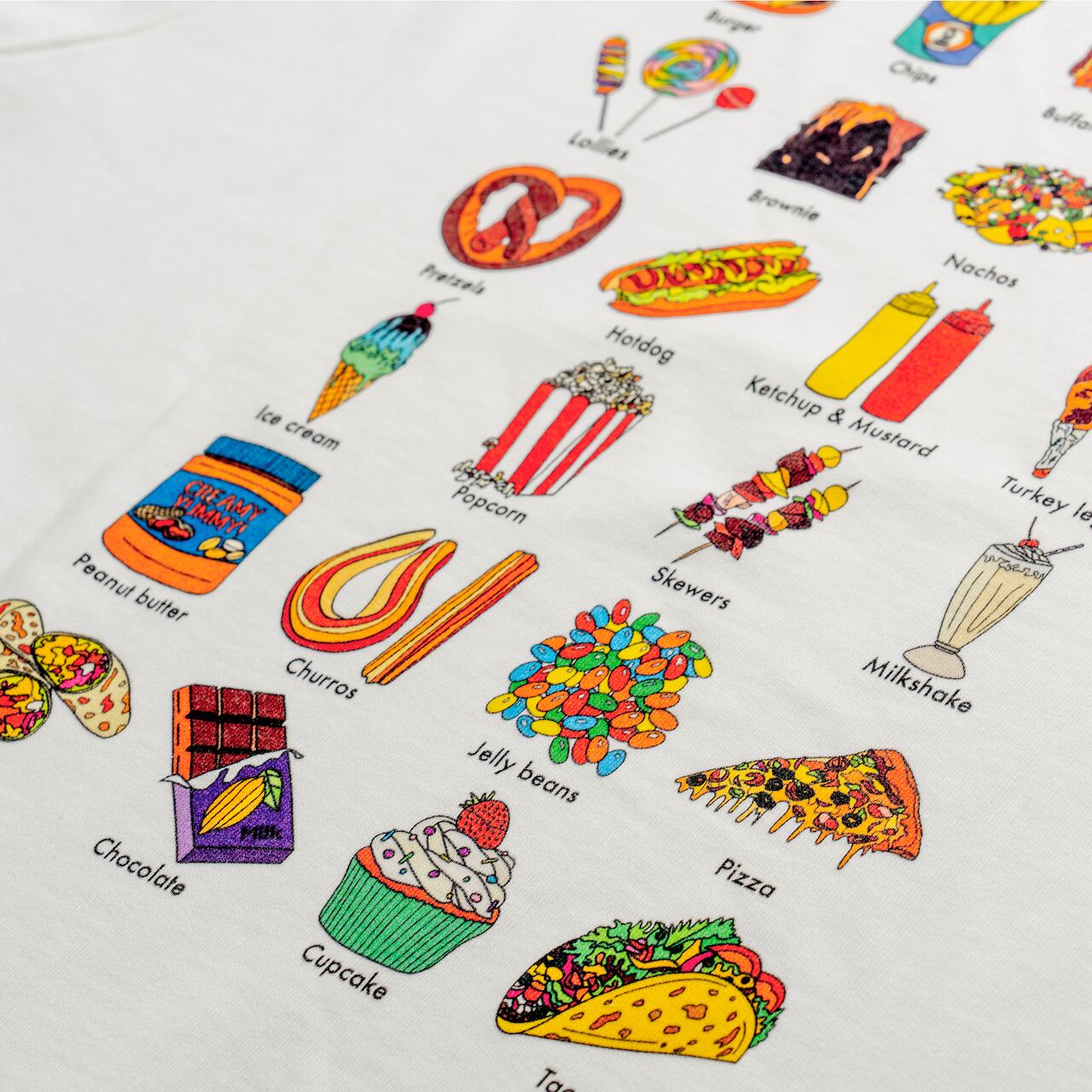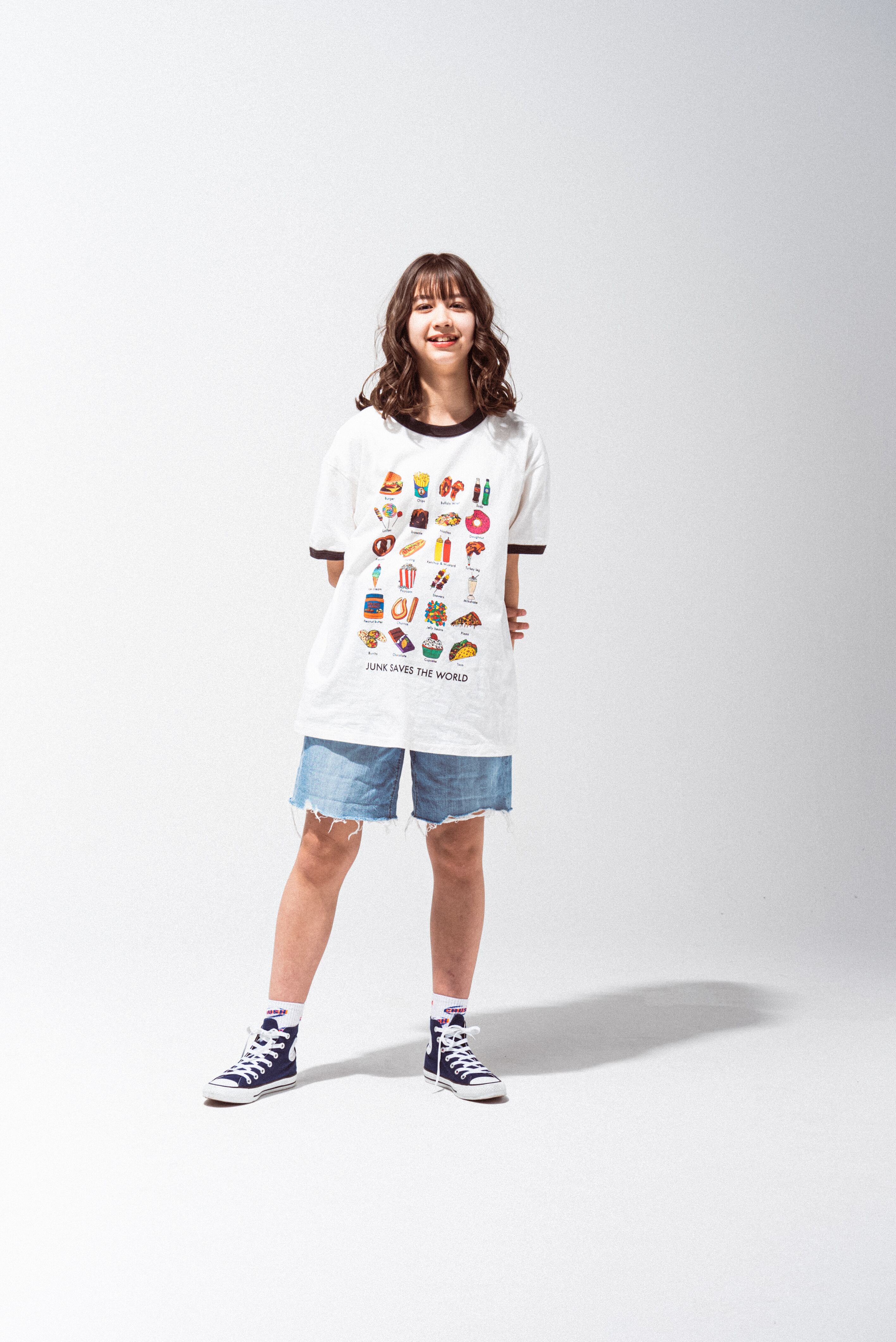 ジャンクフードをこれでもかと散りばめたカラフルなイラストがとてもキュートなリンガーティ。白地に黒色の襟と袖のアクセントがとってもキュートな1枚。
