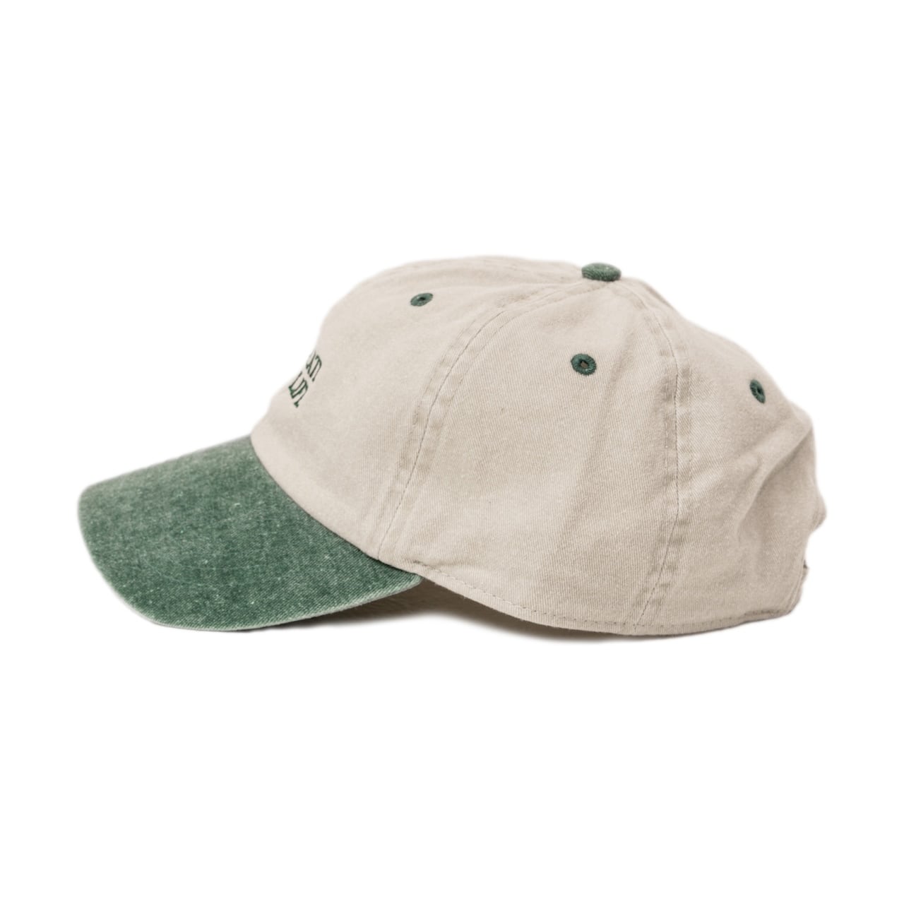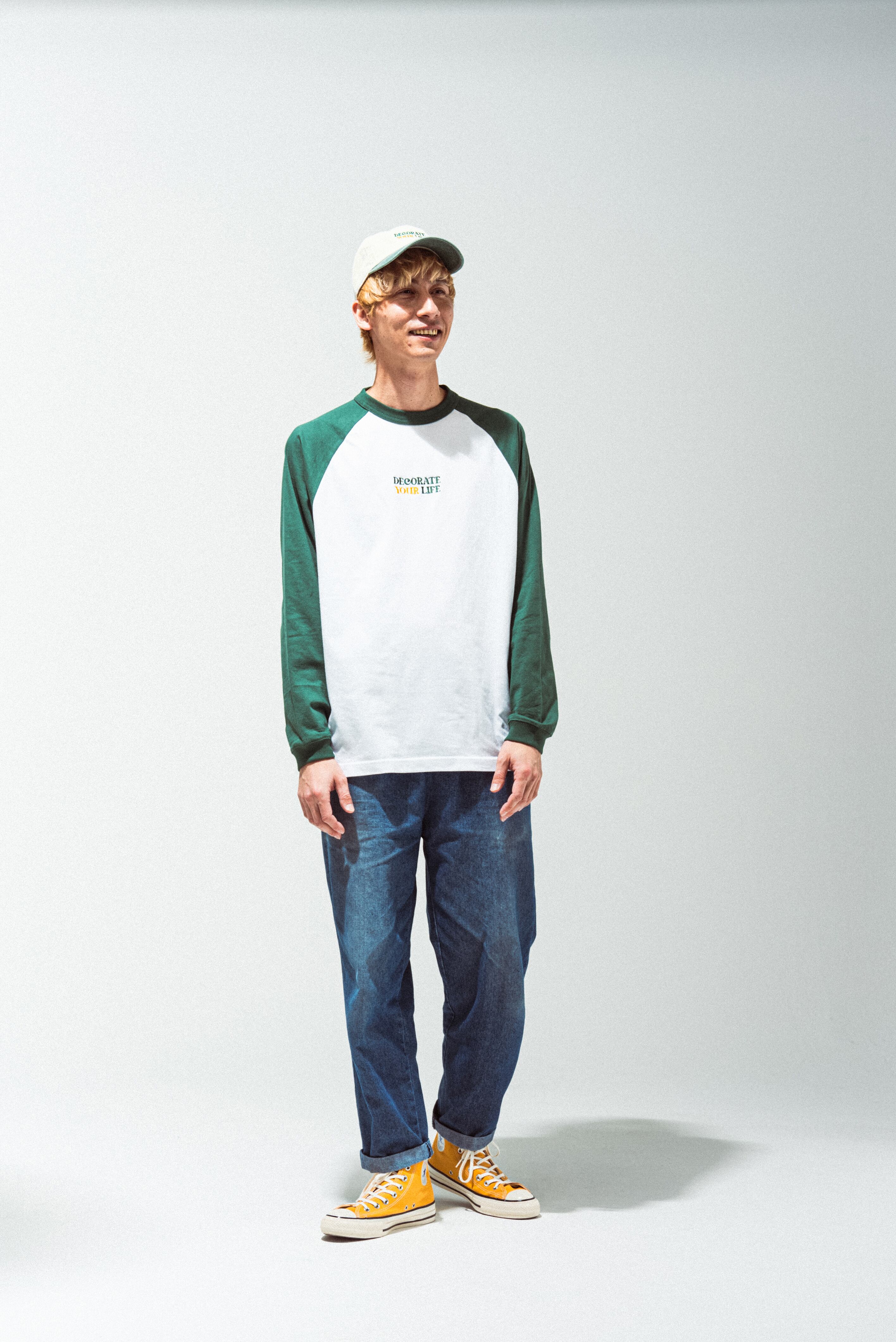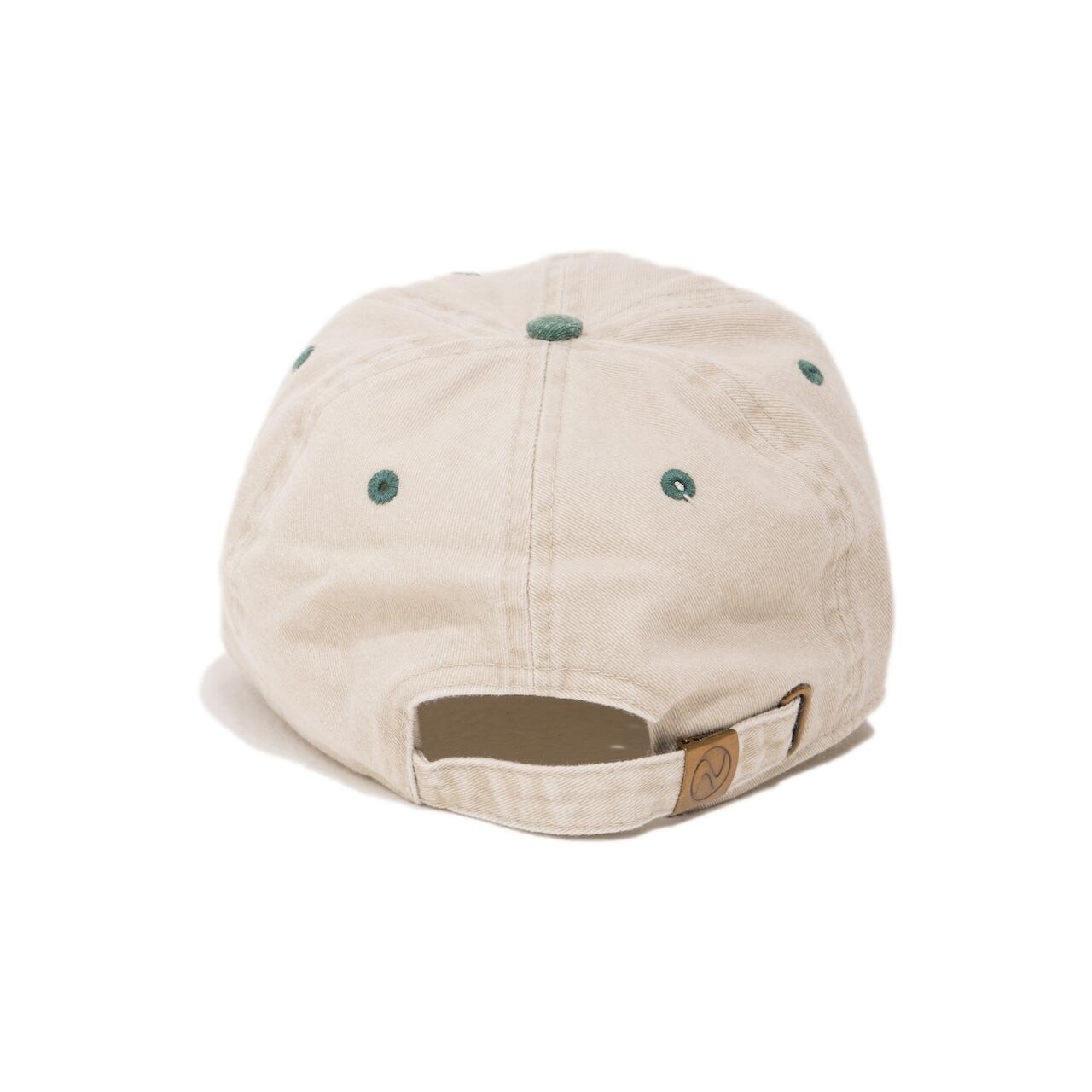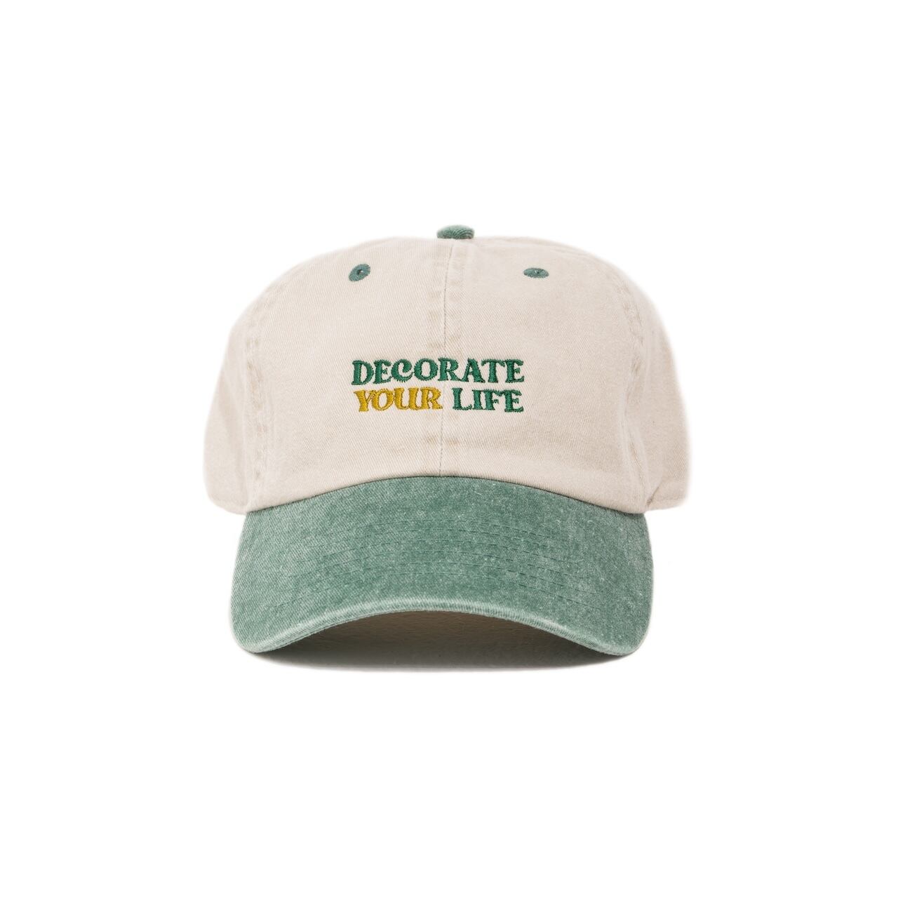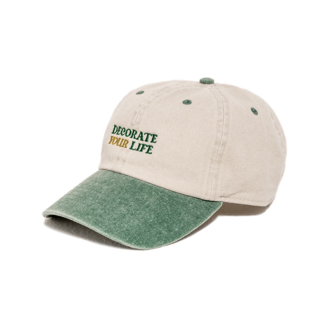 DECORATE YOUR LIFEのベーシックロゴが刺繍されたヴィンテージライクなベースボールキャップ。