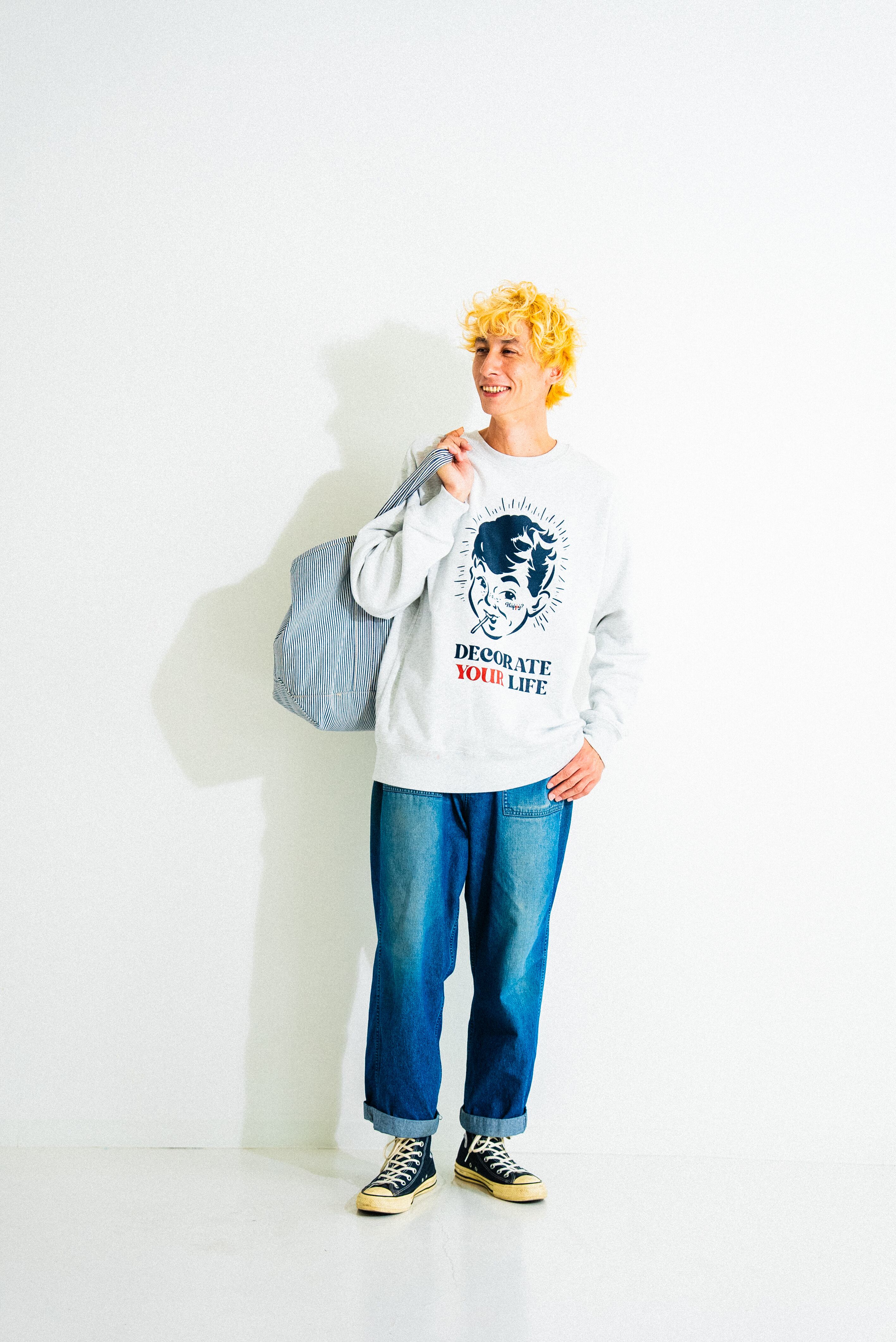 DECORATE YOUR LIFEのアイコニックなキャラクター「DECO BOY」がプリントされたクルーネックスウェットシャツ。